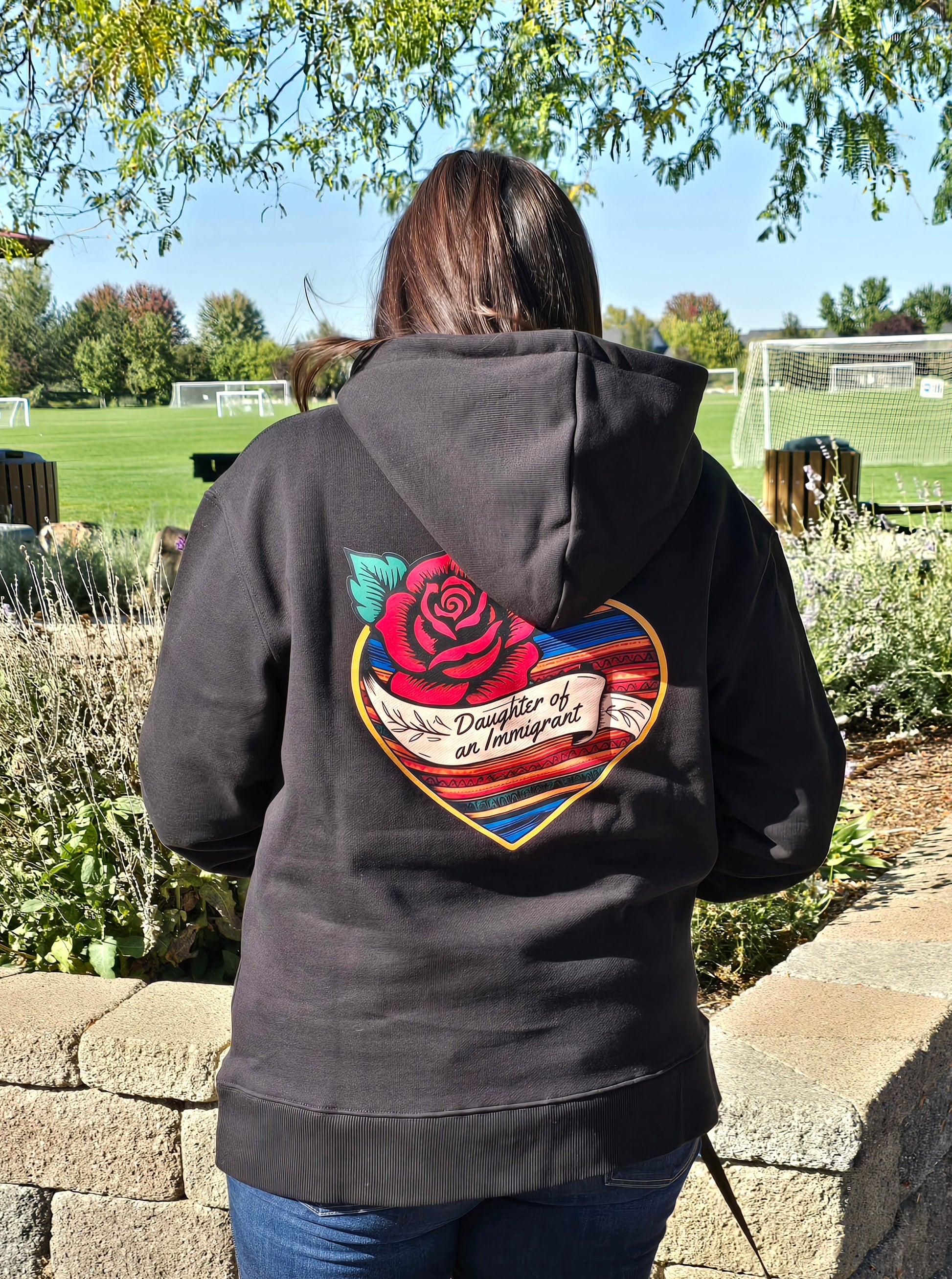 Celebrate your heritage with the Daughter of an Immigrant Hoodie. This black hoodie showcases a vibrant heart design in traditional Mexican colors, adorned with a rose and a banner proudly declaring your roots. Crafted from premium heavyweight fleece, it offers exceptional warmth and durability, making it perfect for everyday wear. Embrace your story in comfort and style while making a powerful statement wherever you go.